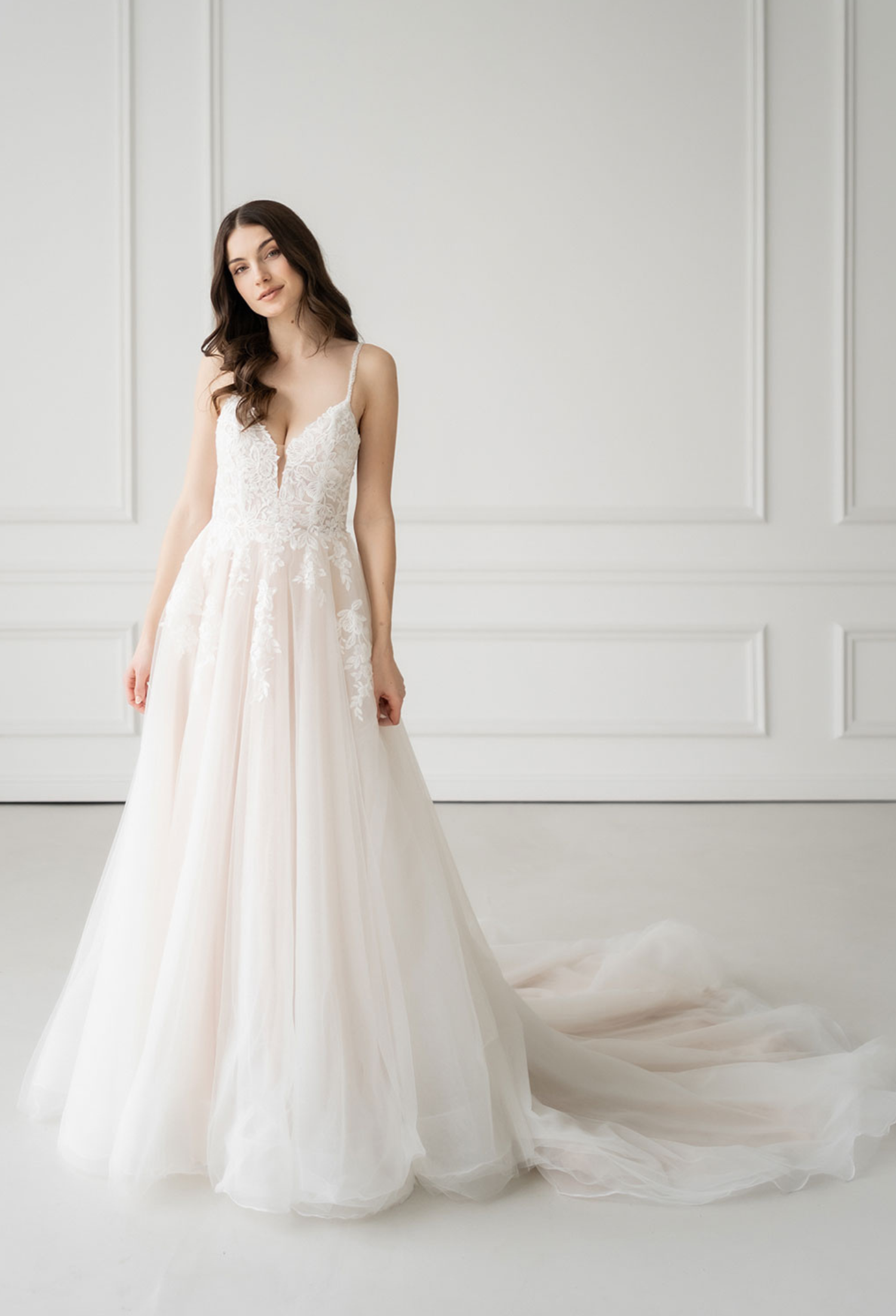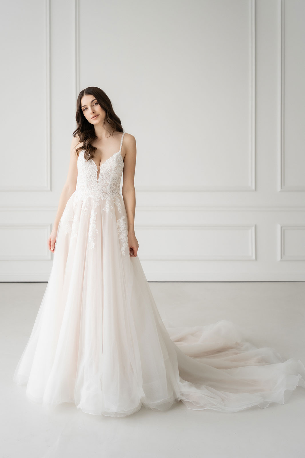 SCARLET ist eine romantische Version eines Prinzessinnenkleids. Der luftige Tüllrock fällt weich und geht in eine extra lange Schleppe über, die dem Kleid eine elegante Länge und eine feminine Silhouette verleiht. Trotz der Schleppe bleibt der Rock leicht und angenehm zu tragen.