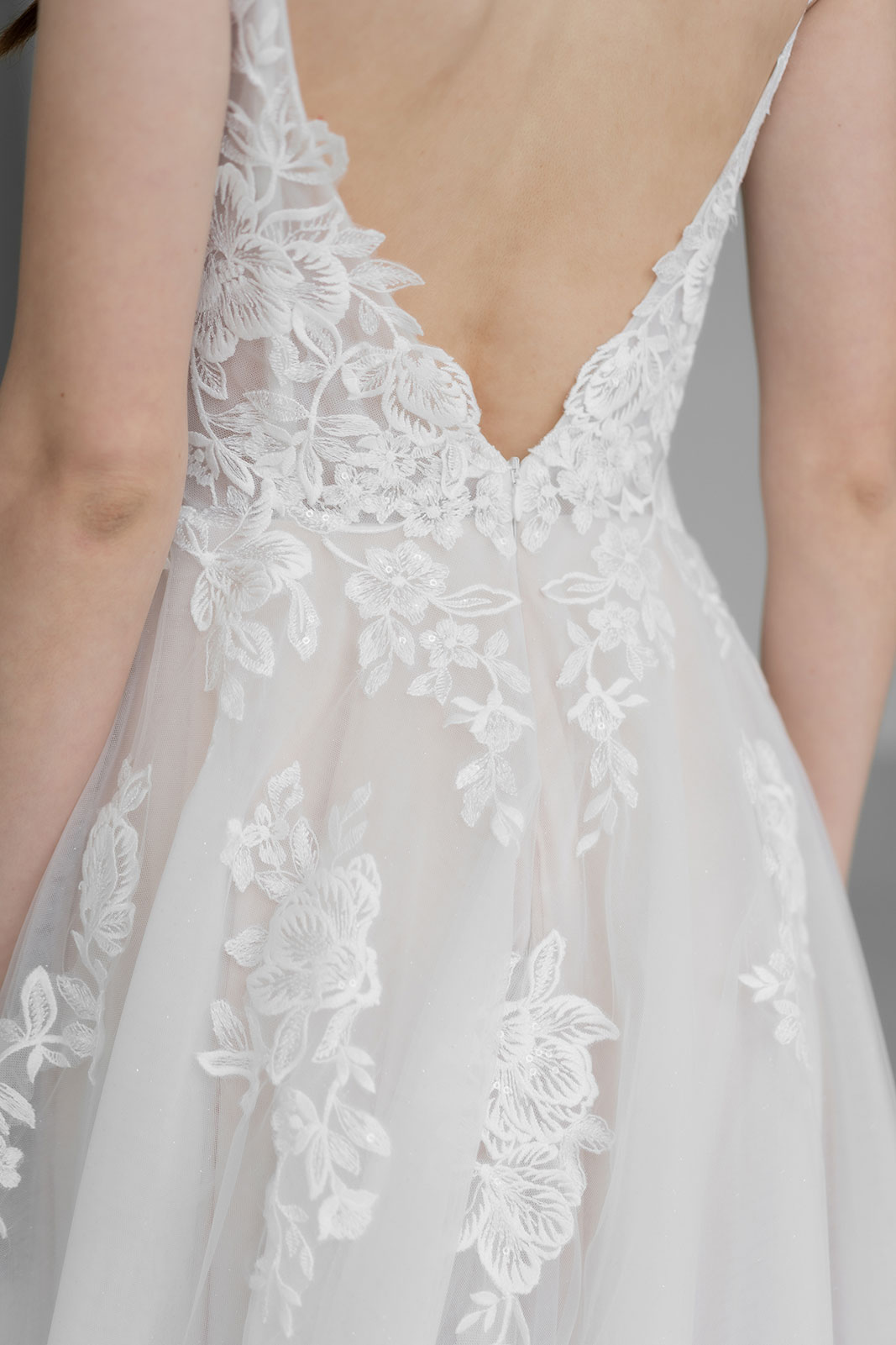 Das Oberteil ist mit feiner, floraler Spitze gearbeitet, die sich harmonisch vom Dekolleté bis in den tiefen Rückenausschnitt fortsetzt. Der tiefe V-Ausschnitt im Vorderteil öffnet den Look und betont das Dekolleté auf moderne, ausgewogene Weise. Schmale Träger mit dezenten Perlen sorgen für einen hochwertigen Akzent und geben dem Kleid eine feine, elegante Leichtigkeit.
