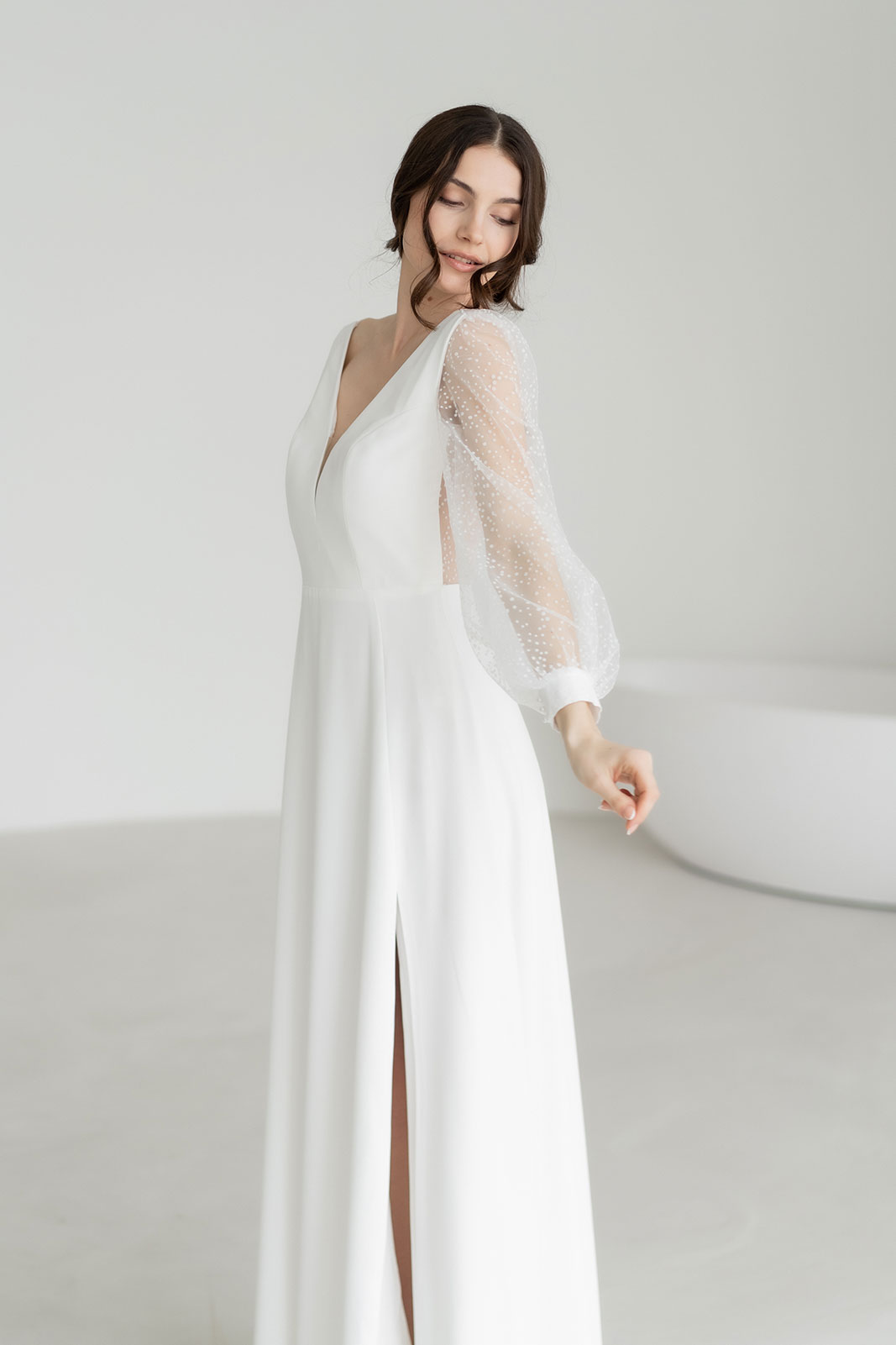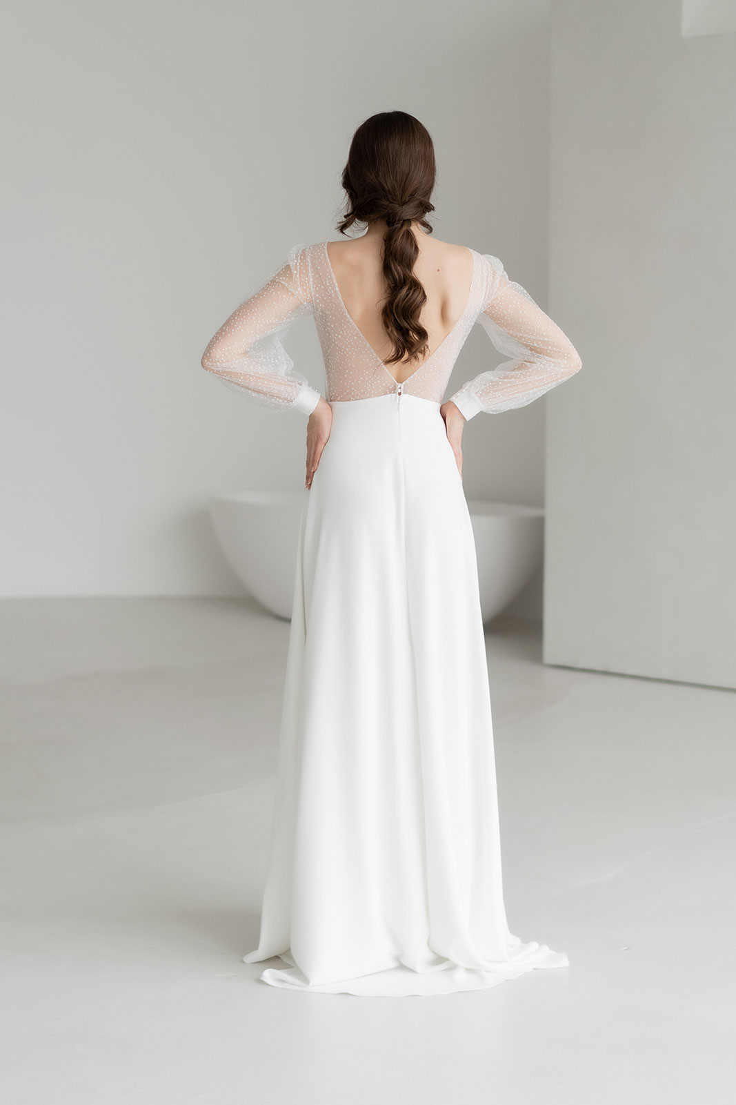 Die luftigen Ärmel aus feinem Pünktchentüll geben dem Kleid Struktur und Leichtigkeit zugleich. Sie stehen im spannenden Kontrast zum tiefen V-Ausschnitt im Rücken, der von zartem Tüll eingefasst ist und das Design ruhig und harmonisch abrundet.