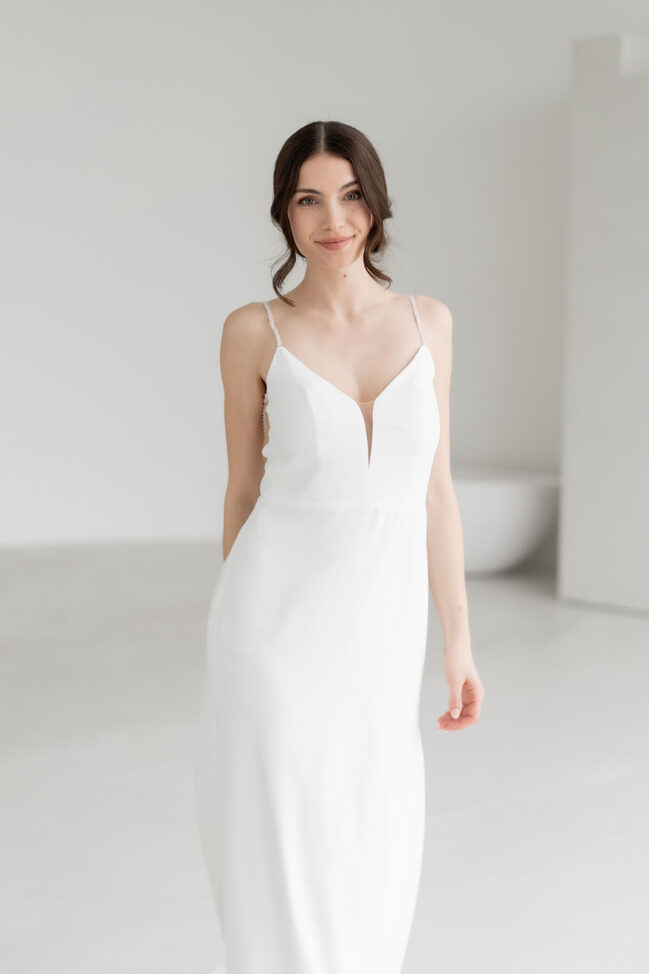 Die schmalen Träger sind dezent mit Perlen verziert und setzen einen hochwertigen Akzent, der dem Kleid Struktur und Eleganz verleiht. Besonderes Highlight ist der tiefe Rückenausschnitt, der dem ansonsten ruhigen Design eine moderne, selbstbewusste Note gibt.