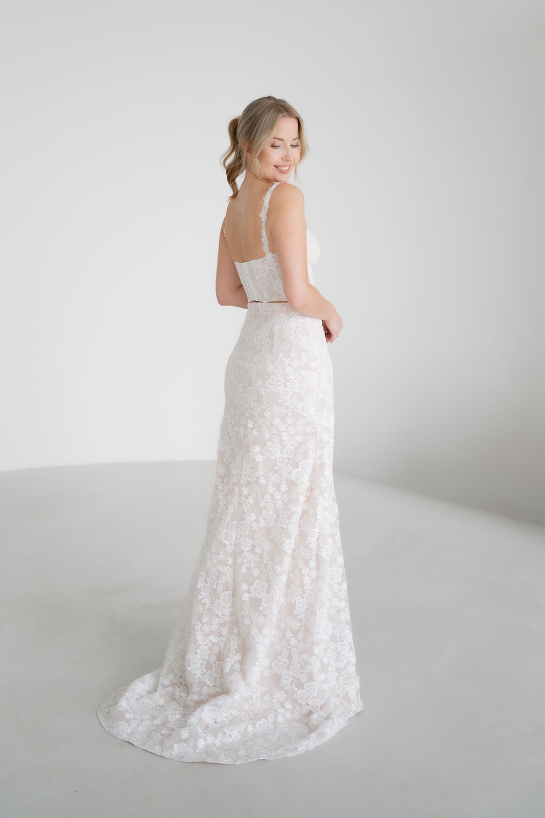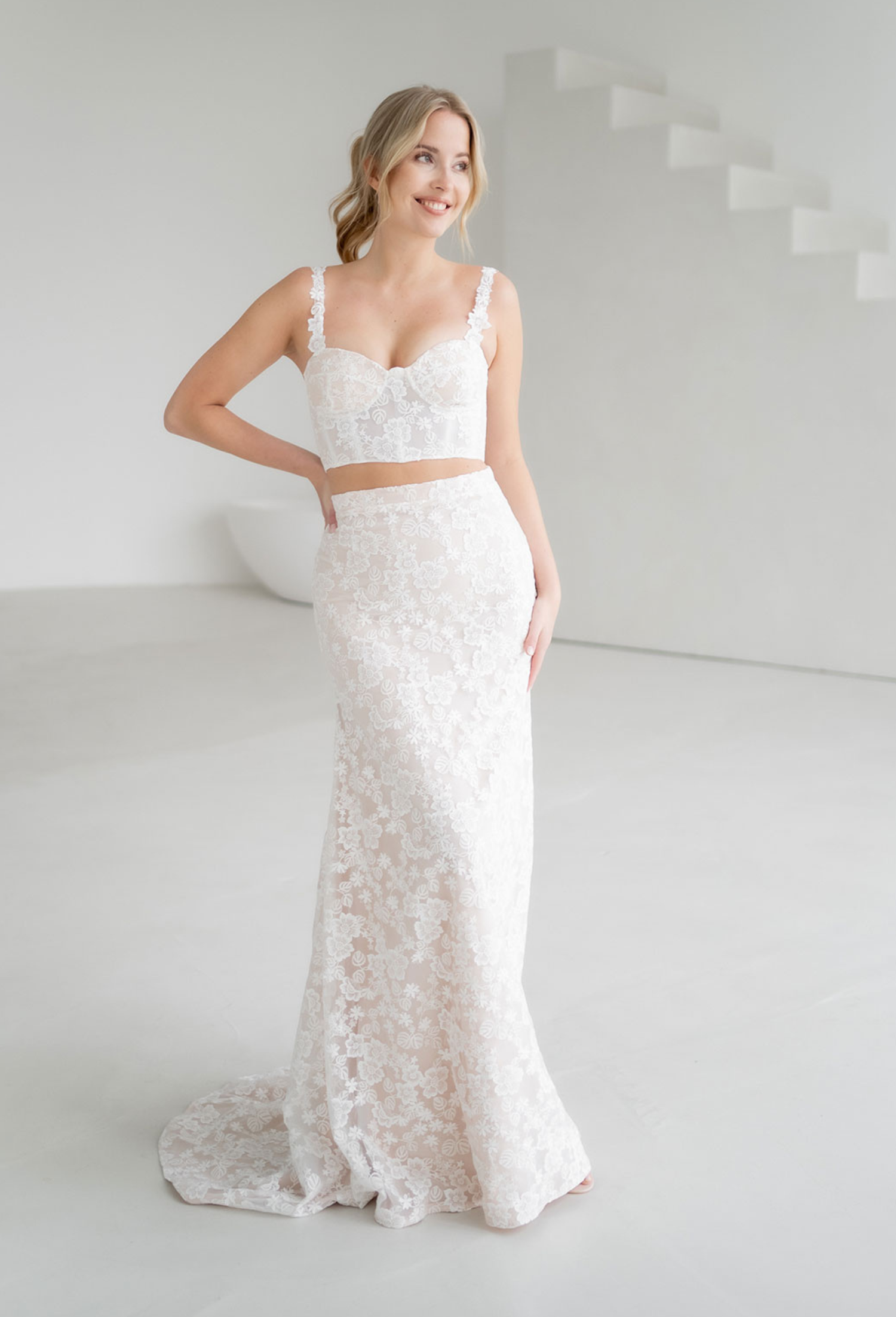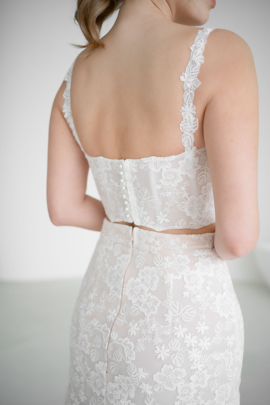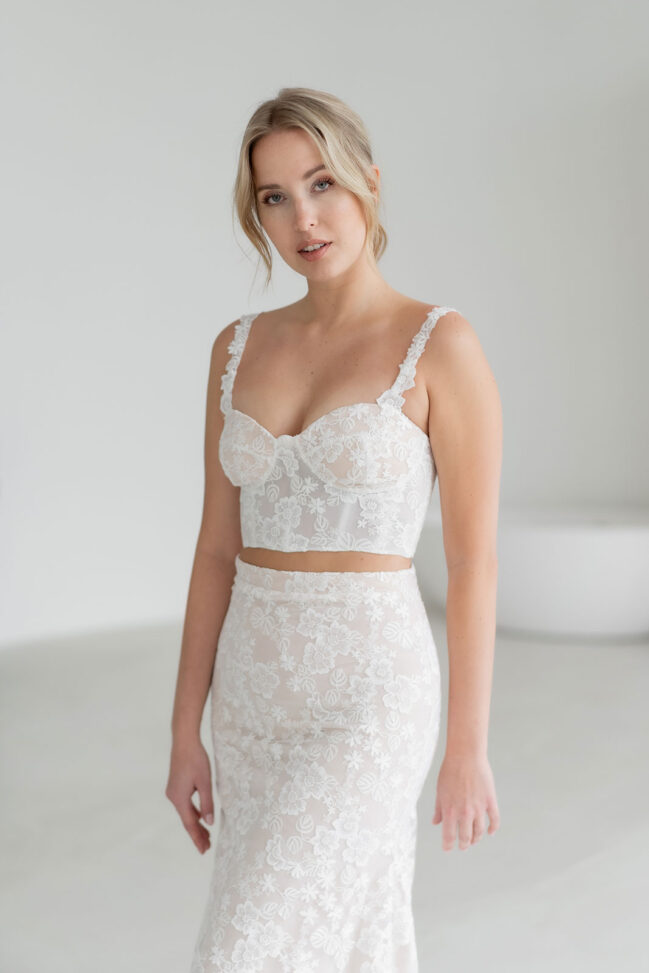 SUKI ist ein Brautzweiteiler für Bräute, die florale Spitze lieben und gleichzeitig einen modernen, klaren Look suchen. Der Zweiteiler besteht aus einem Korsagen-Top und einem Fit-&-Flare-Rock, beide komplett aus detailreicher, floraler Spitze gefertigt.